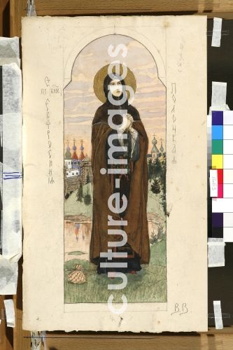 Wasnezow, Viktor Michailowitsch (1848-1926), Heilige Euphrosyne von Polazk (Entwurf für die Fresken in der Wladimirkathedrale in Kiew), Aquarell auf Papier, 48,6x29. 1884-1889. Russland, Jugendstil, Staatliche Tretjakow-Galerie, Moskau.