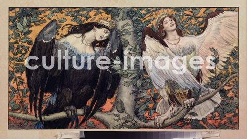 Wasnezow, Viktor Michailowitsch (1848-1926), Sirin und Alkonost. Das Lied der Freude und der Traurigkeit, Aquarell auf Papier, 35,5x67,5, 1919. Russland, Jugendstil, Regionale Kunstgalerie, Taganrog.