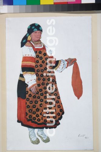 Bakst, Léon (1866-1924), Bäuerin. Kostümentwurf zum Vaudeville Altes Moskau im Théâtre Femina in Paris, 1922, Farblithographie, Theatermalerei, Russland, Privatsammlung