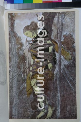 Bakst, Léon (1866-1924), Ida Rubinstein im Theaterstück Das Martyrium des heiligen Sebastian nach Gabriele D'Annuzio, 1922, Farblithographie, Theatermalerei, Russland, Privatsammlung
