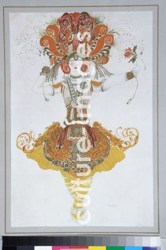 Bakst, Léon (1866-1924), Kostümentwurf für Tamara Karsawina im Ballett Der Feuervogel (L'oiseau de feu) von I. Strawinski, 1909-1910, Farblithographie, Theatermalerei, Russland, Privatsammlung