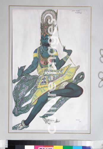 Bakst, Léon (1866-1924), Vaslav Nijinsky. Kostümentwurf zum Ballett Der blaue Gott von R. Hahn, 1912, Farblithographie, Theatermalerei, Russland, Privatsammlung