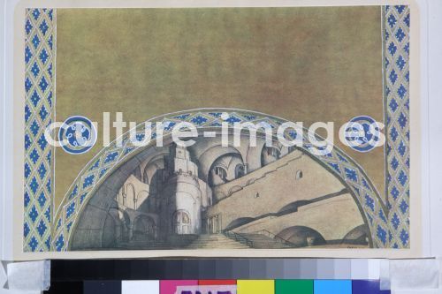 Bakst, Léon (1866-1924), Bühnenbildentwurf zum Theaterstück Das Martyrium des heiligen Sebastian nach Gabriele D'Annuzio, 1922, Farblithographie, Theatermalerei, Russland, Privatsammlung