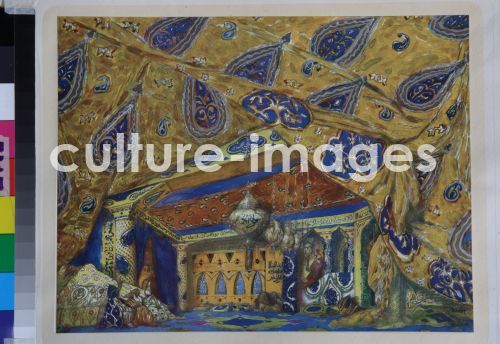 Bakst, Léon (1866-1924), Bühnenbildentwurf zum Ballett Orientalische Fantasie von Ippolitow-Iwanow und Mussorgski, 1913, Farblithographie, Theatermalerei, Russland, Privatsammlung