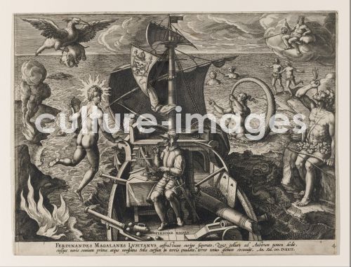 Galle, Philipp (1537-1612), Ferdinandes Magallanes Lusitanus (Americae Retectio), Radierung, 19,8x28,2, Altniederländische Kunst, 1591, Niederlande, Museum Boijmans Van Beuningen, Rotterdam.