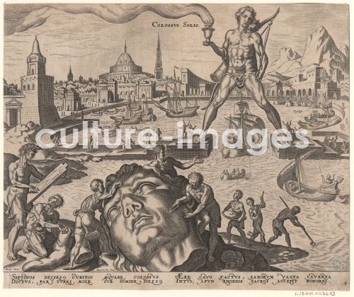 Galle, Philipp (1537-1612), Der Koloss von Rhodos (aus der Folge Die acht Weltwunder) Nach Maarten van Heemskerck, Radierung, 19,9x26,1, Altniederländische Kunst, 1572, Niederlande, Museum Boijmans Van Beuningen, Rotterdam.
