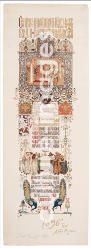 Wasnezow, Viktor Michailowitsch (1848-1926), Speisekarte für das Festmahl anläßlich der Krönung von Nikolaus II. und Alexandra Fjodorowna, Farblithographie, Jugendstil, 1896, Russland.