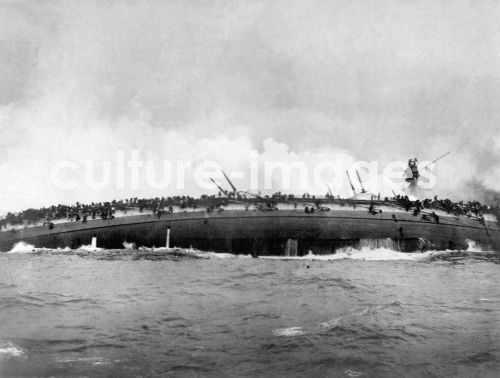 Unbekannter Fotograf, Untergang des von britischen Kriegsschiffen zusammengeschossenen deutschen Panzerkreuzers SMS Blücher im Gefecht auf der Doggerb, Fotografie, 1915, Privatsammlung