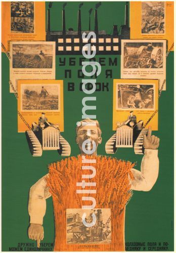 Bulanow, Dmitri Anatoliewitsch (1898-1942), Wir räumen die Felder rechtzeitig, Farblithographie, 102x72, Sowjetische Agitations- und Propagandakunst, 1930, Russland, Russische Staatsbibliothek, Moskau.