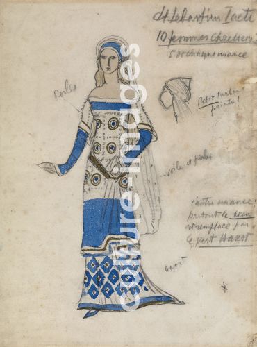 Bakst, Léon (1866-1924), Kostümentwurf zum Theaterstück Das Martyrium des heiligen Sebastian nach Gabriele D'Annuzio, Bleistift, Aquarell, Gold auf Papier, 35,5x26,5, Theatermalerei. 1922, Russland, Privatsammlung.
