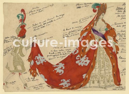 Bakst, Léon (1866-1924), Kostümentwurf zum Ballett Dornröschen von P. Tschaikowski, Bleistift, Aquarell, Gouache, Tusche auf Papier, Theatermalerei. 1921, Russland, Privatsammlung.