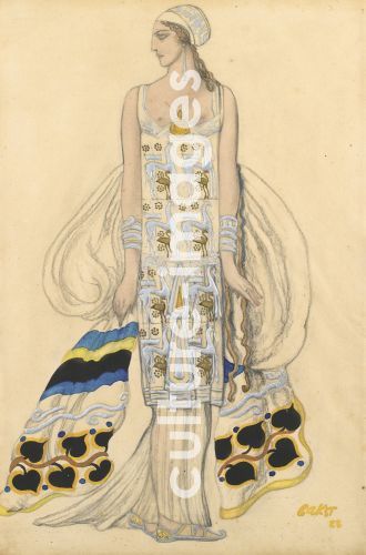 Bakst, Léon (1866-1924), Kostümentwurf für Ida Rubinstein im Theaterstück Phädra (Phèdre) von Jean Racine, Gouache und Tusche auf Papier, 48x32, Theatermalerei. 1923, Russland, Privatsammlung.