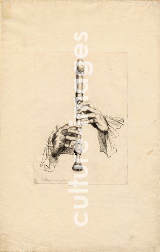 Picart, Bernard (1673–1733), Hände des Blockflötenspielers, Kupferstich, 34,5x22,2, Holland, um 1700, Barock, Privatsammlung.