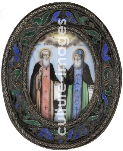 Russische Ikone, Heiligen Dimitri von Rostow und Ignati Brjantschaninow, Silber, Filigran-Email, 8x6,5, Russland, Rostow-Susdaler Schule, Russische IkonenMalerei, Privatsammlung.