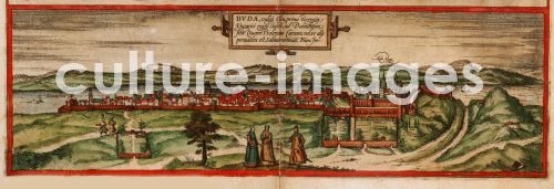 Braun, Georg (1541-1622), Buda, vulgo Ofen (Aus: Civitates orbis terrarium), Kupferstich, Aquarell, Flandern, 1572, Kartografie, Privatsammlung.