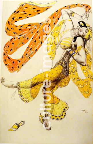 Bakst, Léon (1866-1924), Odaliske. Kostümentwurf zum Ballett Scheherazade von N. Rimski-Korsakow, Aquarell, Gouache auf Papier, Russland, 1910, Theatermalerei, Privatsammlung.