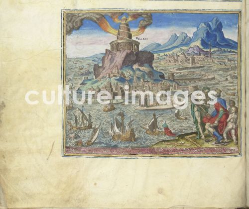 Galle, Philipp (Philips) (1537-1612), Der Leuchtturm von Alexandria (aus der Folge Die acht Weltwunder ), Kupferstich, Aquarell, 20,9x26,1, Niederlande, 1572, Altniederländische Kunst, Rijksmuseum, Amsterdam.