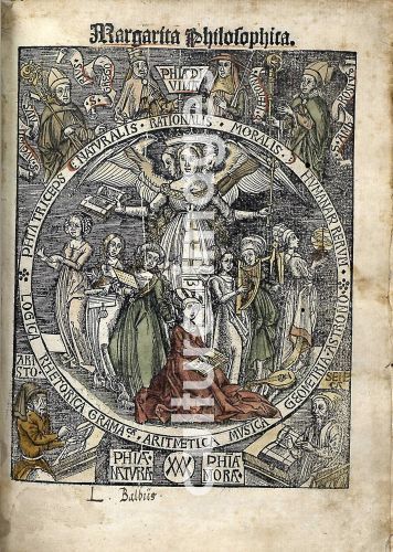 Reisch, Gregor (1467-1525), Margarita Philosophica. Titelseite, Holzschnitt, Deutschland, 1504, Wissenschaftsgeschichte, Privatsammlung.