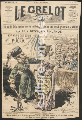 Unbekannter Künstler, Pro Finlandia Aktion. Satire auf die russische Politik in Finnland, Lithografie, Frankreich, 1899. Karikatur, Privatsammlung.