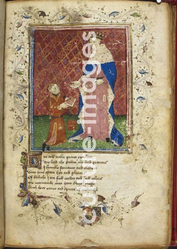 Unbekannter Künstler, Der Autor, der dem König Heinrich V. sein Buch überreicht (aus Regiment of Princes von Thomas Hoccleve), Aquarell auf Pergament, Großbritannien, 15. Jahrhundert, Renaissance, British Library.