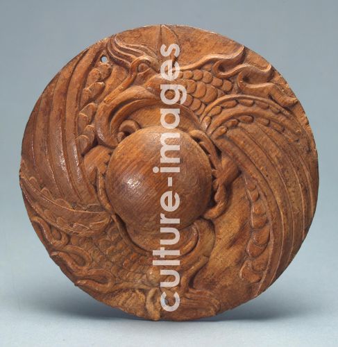 Frühe Kulturen des AltaI. Hügelgrab Pazyryk, Stirnplatte von einem Pferdegeschirr, Holz, D 12. 7, Vorgeschichtliche Kultur, 6. Jahrhundert v. Chr., Staatliche Eremitage, St. Petersburg.