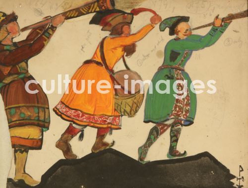 Roerich, Nicholas (1874-1947), Kostümentwurf zur Oper Schneeflöckchen von N. Rimski-Korsakow, Gouache und Tusche auf Papier, 23, 4x31, TheaterMalerei, 1919. Russland, Privatsammlung.