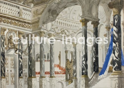 Bakst, Léon (1866-1924), Bühnenbildentwurf zum Ballett Dornröschen von P. Tschaikowski, Aquarell auf Papier, 49x68, Theatermalerei, 1921, Russland, Privatsammlung.