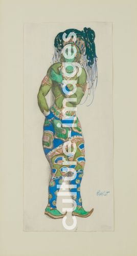 Bakst, Léon (1866-1924), Kostümentwurf zum Ballett "Der blaue Gott" von R. Hahn, Aquarell, Gouache, weisse Farbe, Tusche auf Papier, Theatermalerei, 1910, Russland, Privatsammlung.