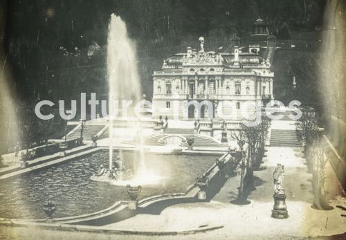 Der bayerische König Ludwig II. ließ Schloss Linderhof 1870-1886 errichten. Schlossanlage mit Wasserbassin und Springbrunnen, Quelle: Dia-handkoloriert, aus Vortragsreihe:Oberammergau und sein Passionsspiel. Sammlung Carl Simon.