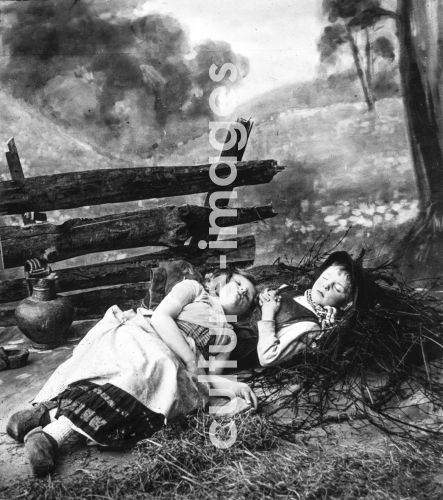 Hänsel und Gretel schlafen im Wald. Mädchen und Junge schlafen unter einem Baum, Quelle: Dia-handkoloriert, aus Vortragsreihe: Hänsel und Gretel. Sammlung Carl Simon.