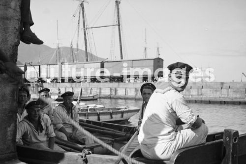 Venezuela, La Guaira, Bundesstaat Vargas, Hafen, Hafenszene, Schulschiff Deutschland, Segelschulschiff. Aus der Sammlung Hanns Tschira, Bordfotograf des Norddeutschen Lloyd 1930-1939. Venezuela, La Guaira, Federal State Vargas, Harbour, Harbour scene, School ship Germany, maritime, Sail school ship. Collection Hanns Tschira, photographer of the North German Lloyd 1930-1939.