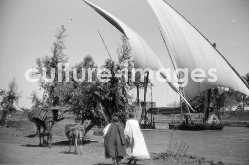 Ägypten, Kanal, Nil, Boot, Segel, Fluss, Segelboot, Felucke. Aus der Sammlung Hanns Tschira, Bordfotograf des Norddeutschen Lloyd 1930-1939. Egypt, Channel, The Nile, Boat, Sail, River, Sailboat. Collection Hanns Tschira, photographer of the North German Lloyd 1930-1939.