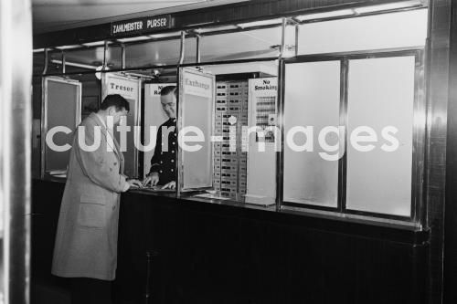 Seefahrt, Interieur, Innenansicht, Inneneinrichtung, Dampfer, Interieur, Norddeutscher Lloyd, TS Bremen, Turbine Steamer, Turbinendampfer, an Bord. Aus der Sammlung Hanns Tschira, Bordfotograf des Norddeutschen Lloyd 1930-1939. Bremen, Interior, Interior view, interior fittings, Steamboat, Passenger Liner, North German Lloyd, Bremen TS, Turbine Steamer, Turbine steamboat, aboard, sea journey, cruise, passage. Collection Hanns Tschira, photographer of the North German Lloyd 1930-1939.