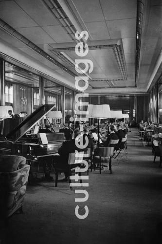 Seefahrt, Interieur, Innenansicht, Inneneinrichtung, Dampfer, Norddeutscher Lloyd, TS Bremen, Turbine Steamer, Turbinendampfer, an Bord. Aus der Sammlung Hanns Tschira, Bordfotograf des Norddeutschen Lloyd 1930-1939. Bremen, Interior, Interior view, interior fittings, Steamboat, Passenger Liner, North German Lloyd, Bremen TS, Turbine Steamer, Turbine steamboat, aboard, sea journey, cruise, passage. Collection Hanns Tschira, photographer of the North German Lloyd 1930-1939.