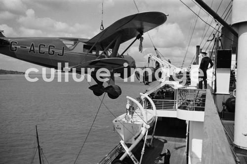 Schiff Bremen, Bordwand, Aussenansicht, Flugzeug, Dampfer, Schiff, Norddeutscher Lloyd, TS Bremen, Turbine Steamer, Turbinendampfer, an Bord. Aus der Sammlung Hanns Tschira, Bordfotograf des Norddeutschen Lloyd 1930-1939. Bremen, plane, Outside view, Aeroplane, Steamboat, Passenger Liner, North German Lloyd, Bremen TS, Turbine Steamer, Turbine steamboat, aboard, sea journey, cruise, passage. Collection Hanns Tschira, photographer of the North German Lloyd 1930-1939.