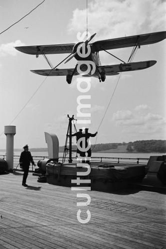 Schiff Bremen, Bordwand, Aussenansicht, Flugzeug, Dampfer, Schiff, Norddeutscher Lloyd, TS Bremen, Turbine Steamer, Turbinendampfer, an Bord. Aus der Sammlung Hanns Tschira, Bordfotograf des Norddeutschen Lloyd 1930-1939. Bremen, plane, Outside view, Aeroplane, Steamboat, Passenger Liner, North German Lloyd, Bremen TS, Turbine Steamer, Turbine steamboat, aboard, sea journey, cruise, passage. Collection Hanns Tschira, photographer of the North German Lloyd 1930-1939.