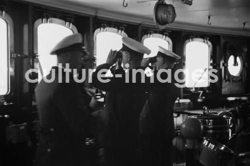 Schiff Bremen, Bordwand, Aussenansicht, Offiziere, Leopold Ziegenbein, Schiff, Norddeutscher Lloyd, TS Bremen, Turbine Steamer, Turbinendampfer, an Bord, Kommodore. Aus der Sammlung Hanns Tschira, Bordfotograf des Norddeutschen Lloyd 1930-1939. Bremen, Captain of the Bremen, Outside view, Officers, Leopold Ziegenbein, Passenger Liner, North German Lloyd, Bremen TS, Turbine Steamer, Turbine steamboat, aboard, Commodore, sea journey, cruise, passage. Collection Hanns Tschira, photographer of the North German Lloyd 1930-1939.