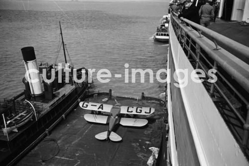 Schiff Bremen, Bordwand, Aussenansicht, Flugzeug, Dampfer, Schiff, Norddeutscher Lloyd, TS Bremen, Turbine Steamer, Turbinendampfer, an Bord, Verladung. Aus der Sammlung Hanns Tschira, Bordfotograf des Norddeutschen Lloyd 1930-1939. Bremen, plane, Outside view, Aeroplane, Steamboat, Passenger Liner, North German Lloyd, Bremen TS, Turbine Steamer, Turbine steamboat, aboard, Loading, sea journey, cruise, passage. Collection Hanns Tschira, photographer of the North German Lloyd 1930-1939.