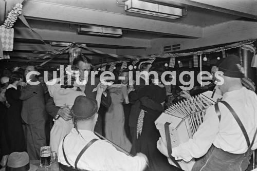 Seefahrt, Interieur, Tanz, Inneneinrichtung, Dampfer, Norddeutscher Lloyd, TS Bremen, Turbine Steamer, Turbinendampfer, an Bord. Aus der Sammlung Hanns Tschira, Bordfotograf des Norddeutschen Lloyd 1930-1939. Bremen, Interior, Dance, interior fittings, Steamboat, Passenger Liner, North German Lloyd, Bremen TS, Turbine Steamer, Turbine steamboat, aboard, sea journey, cruise, passage. Collection Hanns Tschira, photographer of the North German Lloyd 1930-1939.