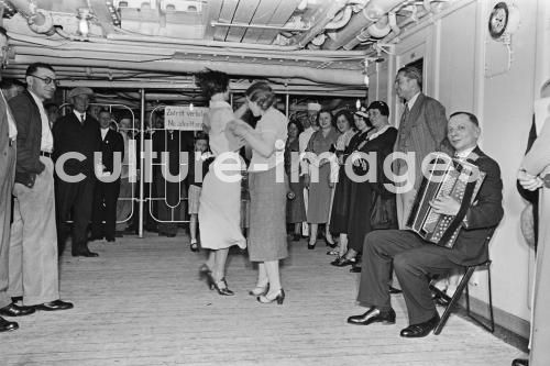 Seefahrt, Interieur, Tanz, Inneneinrichtung, Dampfer, Norddeutscher Lloyd, TS Bremen, Turbine Steamer, Turbinendampfer, an Bord. Aus der Sammlung Hanns Tschira, Bordfotograf des Norddeutschen Lloyd 1930-1939. Bremen, Interior, Dance, interior fittings, Steamboat, Passenger Liner, North German Lloyd, Bremen TS, Turbine Steamer, Turbine steamboat, aboard, sea journey, cruise, passage. Collection Hanns Tschira, photographer of the North German Lloyd 1930-1939.