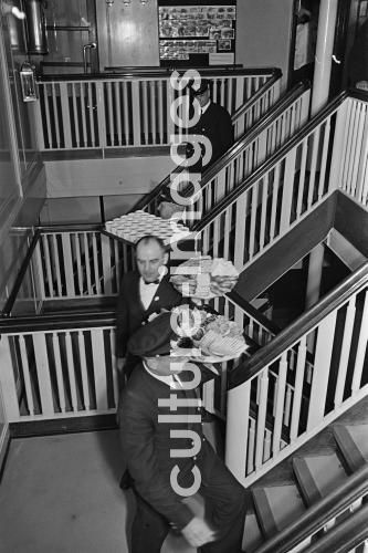 Seefahrt, Interieur, Innenansicht, Speisesaal, Dampfer, Norddeutscher Lloyd, TS Bremen, Turbine Steamer, Turbinendampfer, an Bord. Aus der Sammlung Hanns Tschira, Bordfotograf des Norddeutschen Lloyd 1930-1939. Bremen, Interior, Interior view, Dining room, Steamboat, Passenger Liner, North German Lloyd, Bremen TS, Turbine Steamer, Turbine steamboat, aboard, sea journey, cruise, passage. Collection Hanns Tschira, photographer of the North German Lloyd 1930-1939.