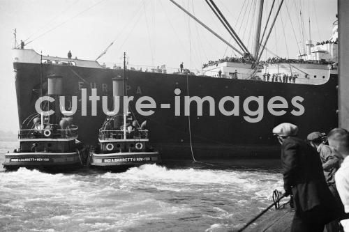 USA, New York, Norddeutscher Lloyd, Schiff Europa, Passagierschiff, Aussenansicht, Dampfer, Dampfschiffahrt, Schiff , Aussenansicht, Schiffahrt. Aus der Sammlung Hanns Tschira, Bordfotograf des Norddeutschen Lloyd 1930-1939. Navigation, USA, New York City, North German Lloyd, Ship Europa, Passenger liner, Sea ship, Steamboat, Steam navigation, Ship, Europa, Navigation . Collection Hanns Tschira, photographer of the North German Lloyd 1930-1939.