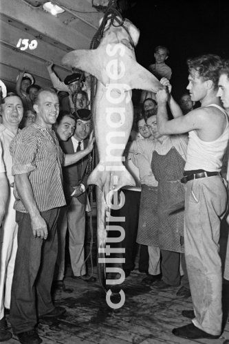 Fang eines Hai, auf dem Passagierschiff Bremen, Seefahrt, Norddeutscher Lloyd, Schiff, Passagierschiff, Seeschiff, Dampfer, Dampfschiffahrt. Aus der Sammlung Hanns Tschira, Bordfotograf des Norddeutschen Lloyd 1930-1939 navigation, ship Columbus, North German Lloyd, ship, passenger liner, sea ship, steamboat, steam navigation, interior, interior. Collection Hanns Tschira, photographer of the North German Lloyd 1930-1939
