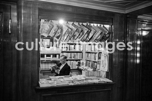 Kiosk, Schiffskiosk, Zeitschriftenkiosk auf der Columbus. Dampfschiffahrt, Seeschiff, Dampfer, Passagierschiff, Dampfschiff, Schiffahrt, Interieur, Innenraum. Aus der Sammlung Hanns Tschira, Bordfotograf des Norddeutschen Lloyd 1930-1939 Newspaper kiosk on the Columbus. North German Lloyd, ship Columbus, steam navigation, sea ship, steamboat, passenger liner, steamer, navigation, interior, interior. Collection Hanns Tschira, photographer of the North German Lloyd 1930-1939