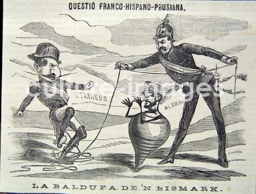 PRIM, JUAN, spanischer Politiker und Militär, REUS 1814-1870 , Karikatur in der Zeitschrift Satirica, LA CAMPANA DE GRACIA , 1870, SOBRE LA CUESTION FRANCO-HISPANO-PRUSIANA : Napoleon III, PRIM Y BISMARK - PRIM, JUAN POLITICO Y MILITAR ESPAÑOL. REUS 1814-1870 CARICATURA EN LA REVISTA SATIRICA LA CAMPANA DE GRACIA , AÑO 1870, SOBRE LA CUESTION FRANCO-HISPANO-PRUSIANA : NAPOLEON III, PRIM Y BISMARK