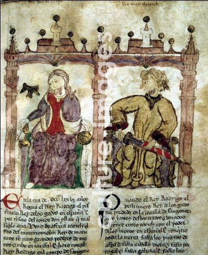 Roderich ( links ), letzter westgotischer König in Hispanien, Westgoten, 710 - 711. Tariq ibn Ziyad ( rechts ) muslimischer Eroberer von Spanien 711 SEMBLANZAS DE REYES BIBLIOTECA NACIONAL . MADRID - RODRIGO, DON ( IZQUIERDA ) ULTIMO REY VISIGODO 710 - 711 TARIK ( DERECHA ) GENERAL ARABE, INVADIO ESPAÑA EN EL AÑO 711 SEMBLANZAS DE REYES BIBLIOTECA NACIONAL . MADRID