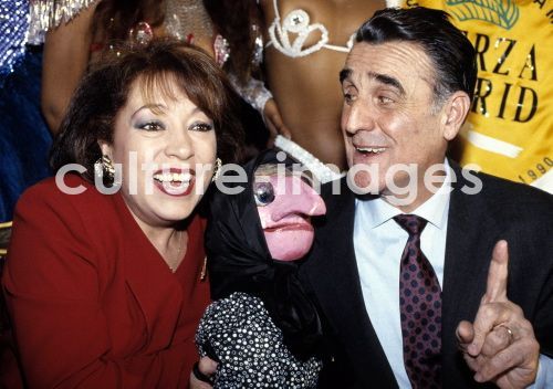 RODRIGUEZ SAHAGUN, AGUSTIN, spanischer Politiker, JUNTO CON MARI CARMEN Y SUS MUÑECOS DURANTE UNA RUEDA DE PRENSA EN 1991 - RODRIGUEZ SAHAGUN, AGUSTIN POLITICO ESPAÑOL. JUNTO CON MARI CARMEN Y SUS MUÑECOS DURANTE UNA RUEDA DE PRENSA EN 1991