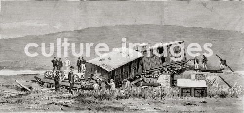 Eisenbahn in Spanien, Entgleisung von einem Zug zwischen FUENTES und MARCHENA, PROVINCIA DE SEVILLA, 1883 Stich, Unfall, Zugkatastrophe, Zugunglück, Katastrophe - FERROCARRILES ESPAÑA DESCARRILAMIENTO DEL TREN ENTRE FUENTES Y MARCHENA, PROVINCIA DE SEVILLA, AÑO 1883 Grabado , Illustration