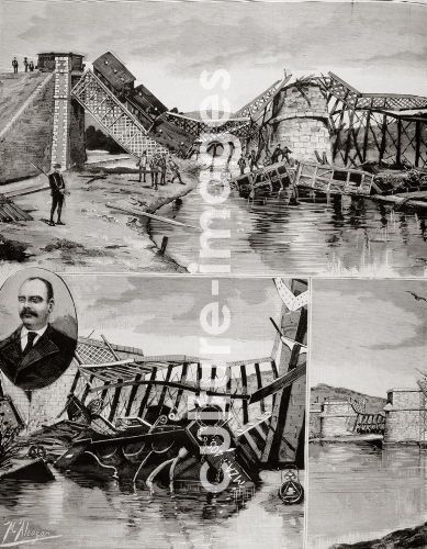 Eisenbahn in Spanien, Einsturz von Brücke, Absturz von Zug, Entgleisung über dem Fluss in CIUDAD REAL, 1884 Stich, Unfall, Zugkatastrophe, Zugunglück, Katastrophe - FERROCARRILES ESPAÑA TREN Y PUENTE CAIDOS SOBRE EL RIO EN CIUDAD REAL, AÑO 1884 Grabado , Illustration