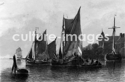 Schiffe, darunter Tjalken, mit Fischkorb vor Uferlandschaft mit Burg. Waldorp, Antonie Stein. Getönt ca. 1850